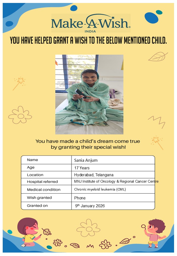 By supporting this campaign, you can help turn a child’s dream into reality, giving them strength, hope, and smiles for a brighter future. Your contribution spreads joy, courage, and inspiration to children in Hyderabad who need it most and helps them believe in the magic of dreams, even in the toughest times.