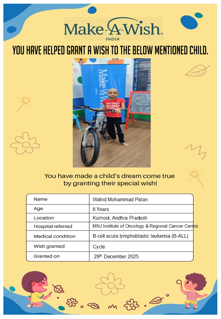 At an average cost of INR 10,000, every wish covers planning, logistics, and the magical experience itself, and by supporting this campaign, you are not just creating smiles but giving children hope, strength, and a better chance of recovery.