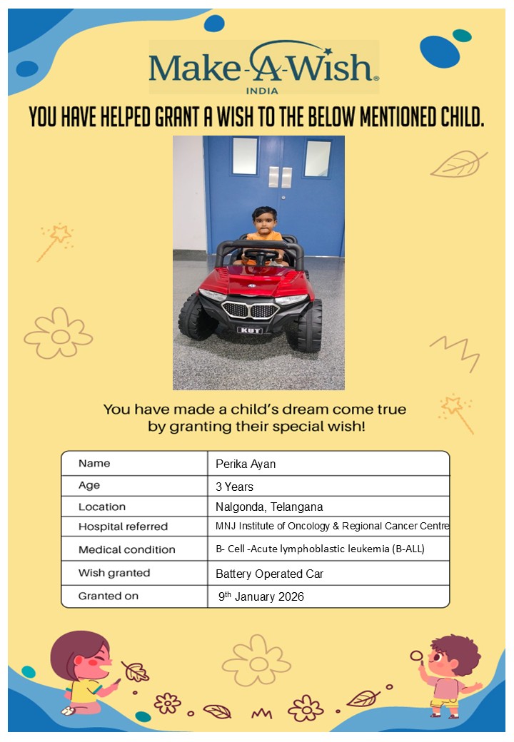 At an average cost of INR 10,000, every wish covers planning, logistics, and the magical experience itself, and by supporting this campaign, you are not just creating smiles but giving children hope, strength, and a better chance of recovery.