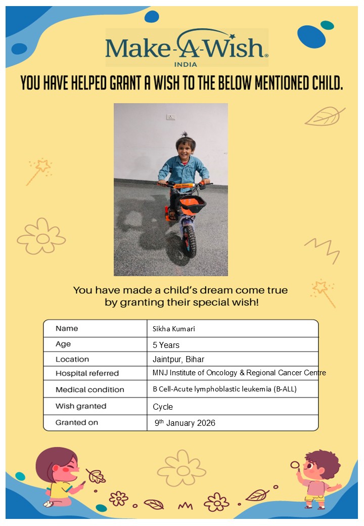 At an average cost of INR 10,000, every wish covers planning, logistics, and the magical experience itself, and by supporting this campaign, you are not just creating smiles but giving children hope, strength, and a better chance of recovery.