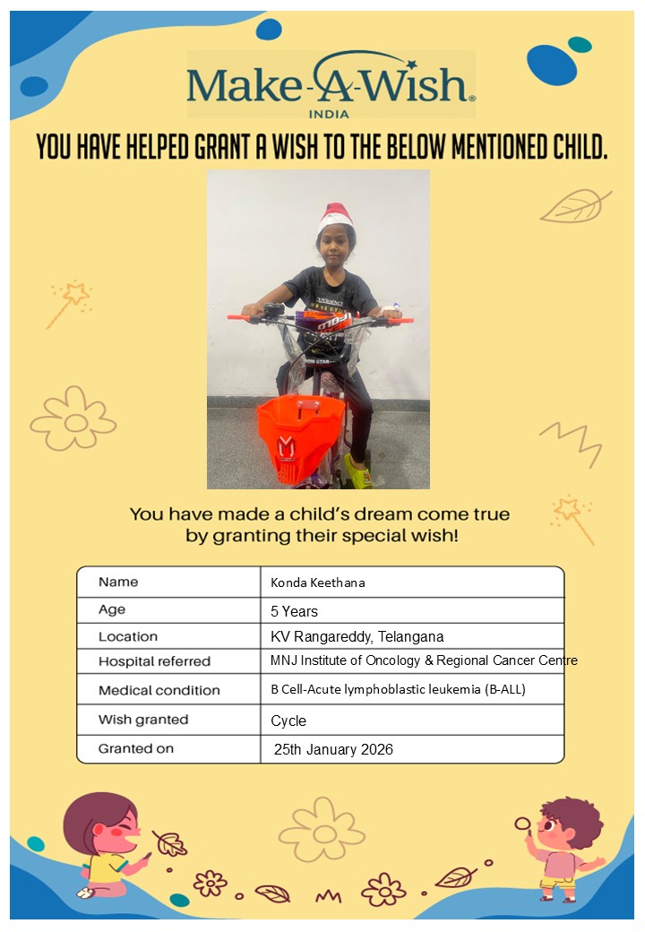 By supporting this campaign, you can help turn a child’s dream into reality, giving them strength, hope, and smiles for a brighter future. Your contribution spreads joy, courage, and inspiration to children in Hyderabad who need it most and helps them believe in the magic of dreams, even in the toughest times.