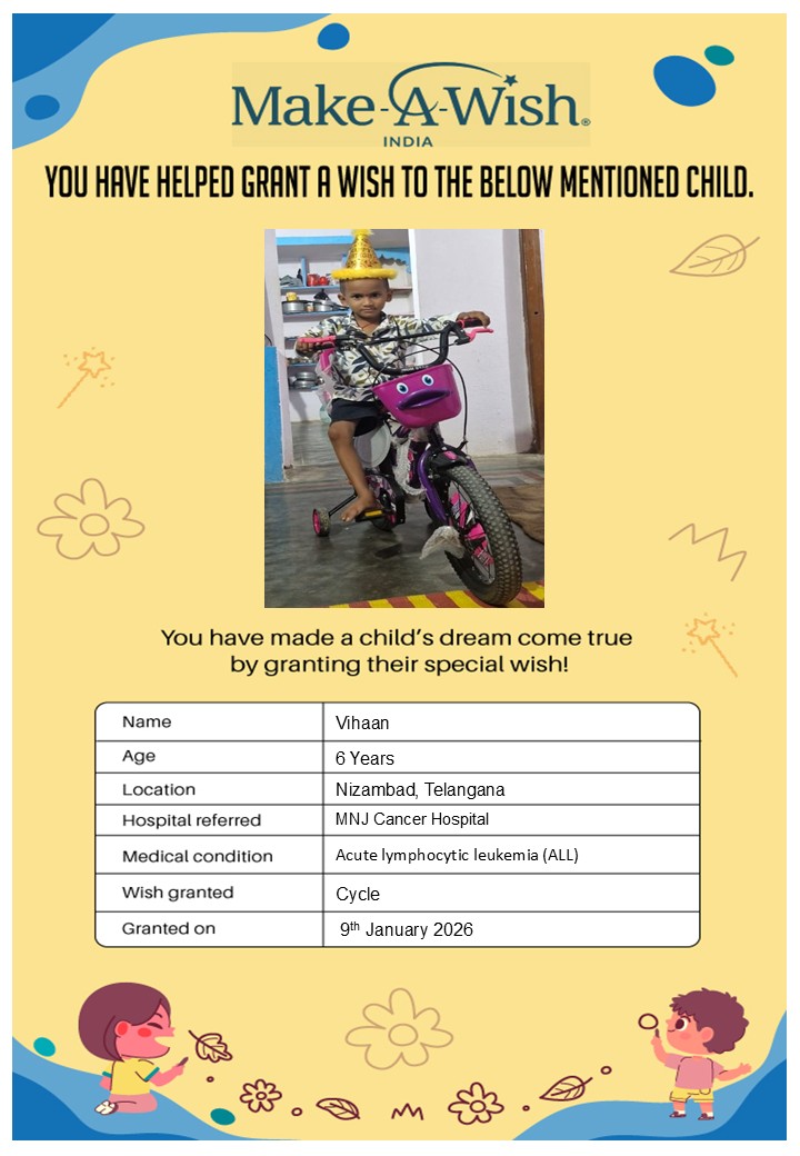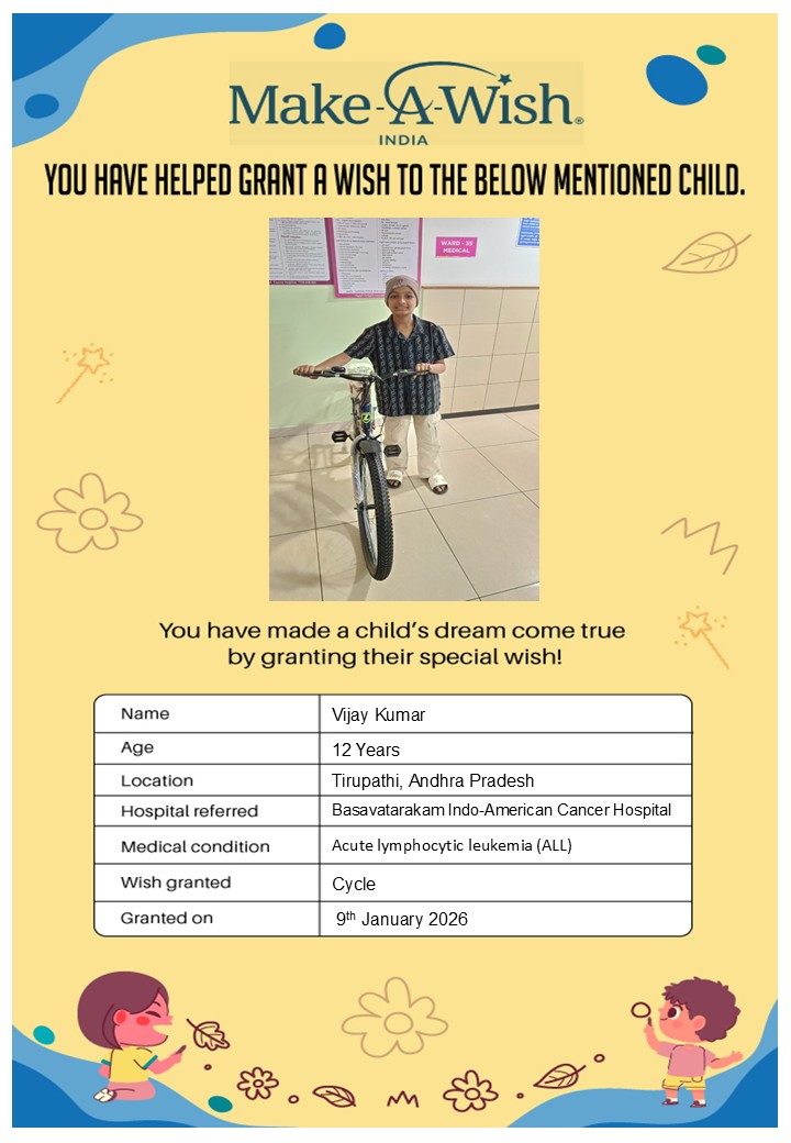 At an average cost of INR 10,000, every wish covers planning, logistics, and the magical experience itself, and by supporting this campaign, you are not just creating smiles but giving children hope, strength, and a better chance of recovery.