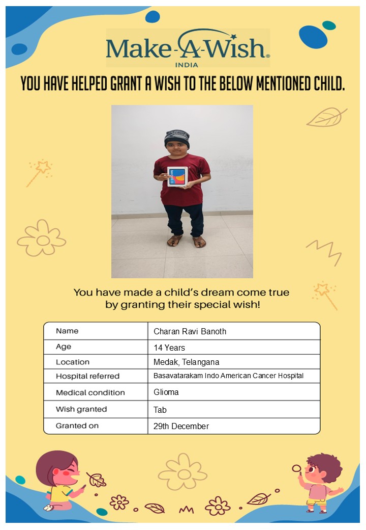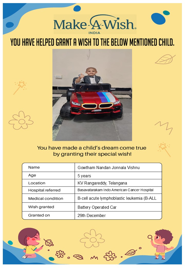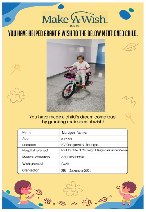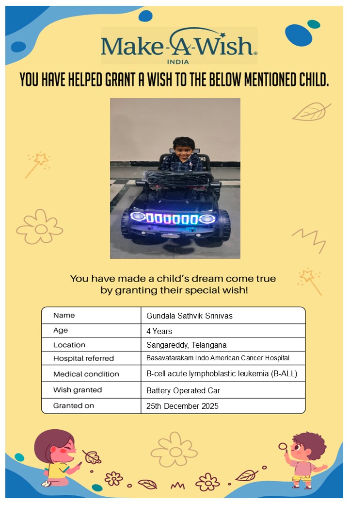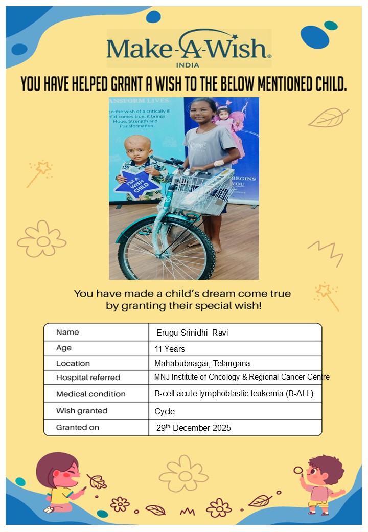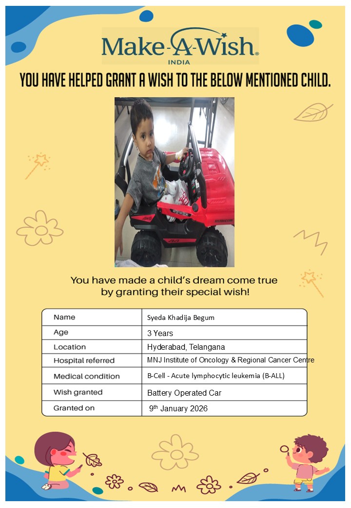 By supporting this campaign, you can help turn a child’s dream into reality, giving them strength, hope, and smiles for a brighter future. Your contribution spreads joy, courage, and inspiration to children in Hyderabad who need it most and helps them believe in the magic of dreams, even in the toughest times.