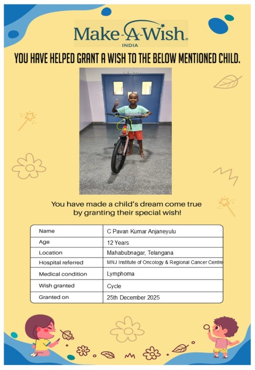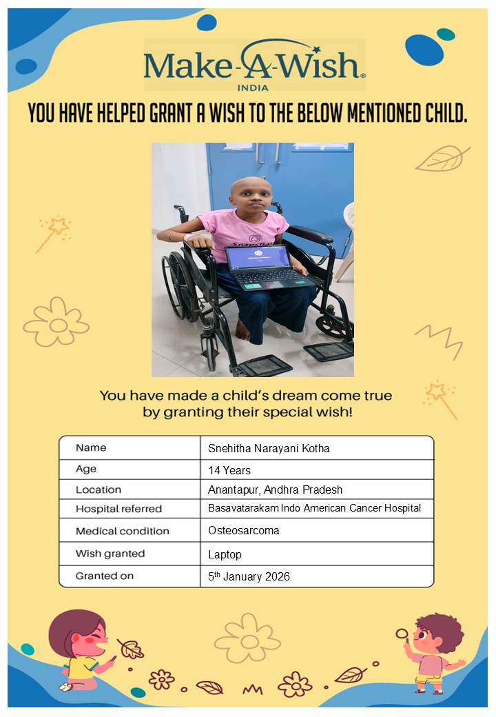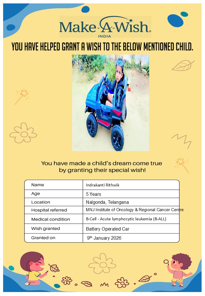 At an average cost of INR 10,000, every wish covers planning, logistics, and the magical experience itself, and by supporting this campaign, you are not just creating smiles but giving children hope, strength, and a better chance of recovery.