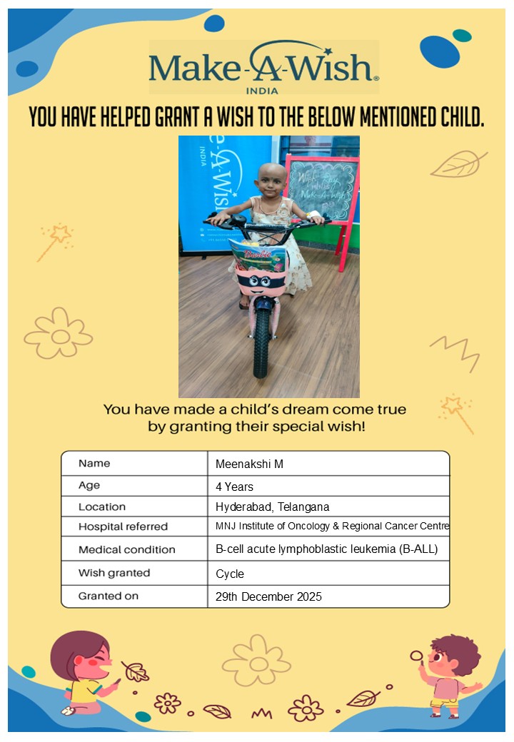 At an average cost of INR 10,000, every wish covers planning, logistics, and the magical experience itself, and by supporting this campaign, you are not just creating smiles but giving children hope, strength, and a better chance of recovery.