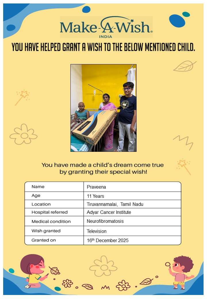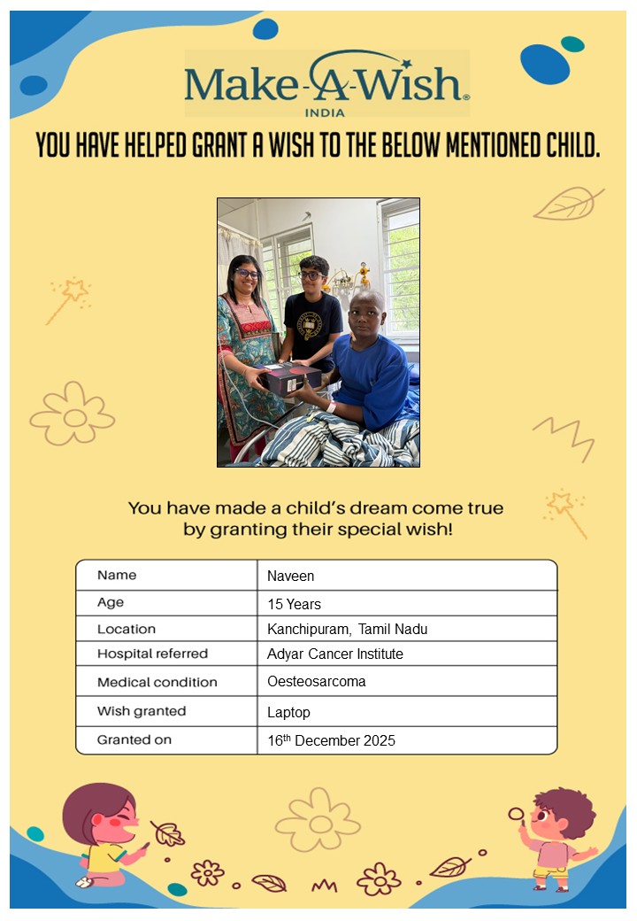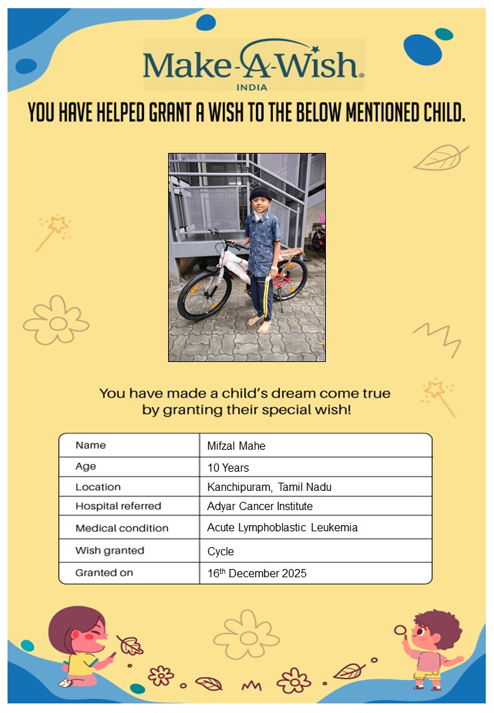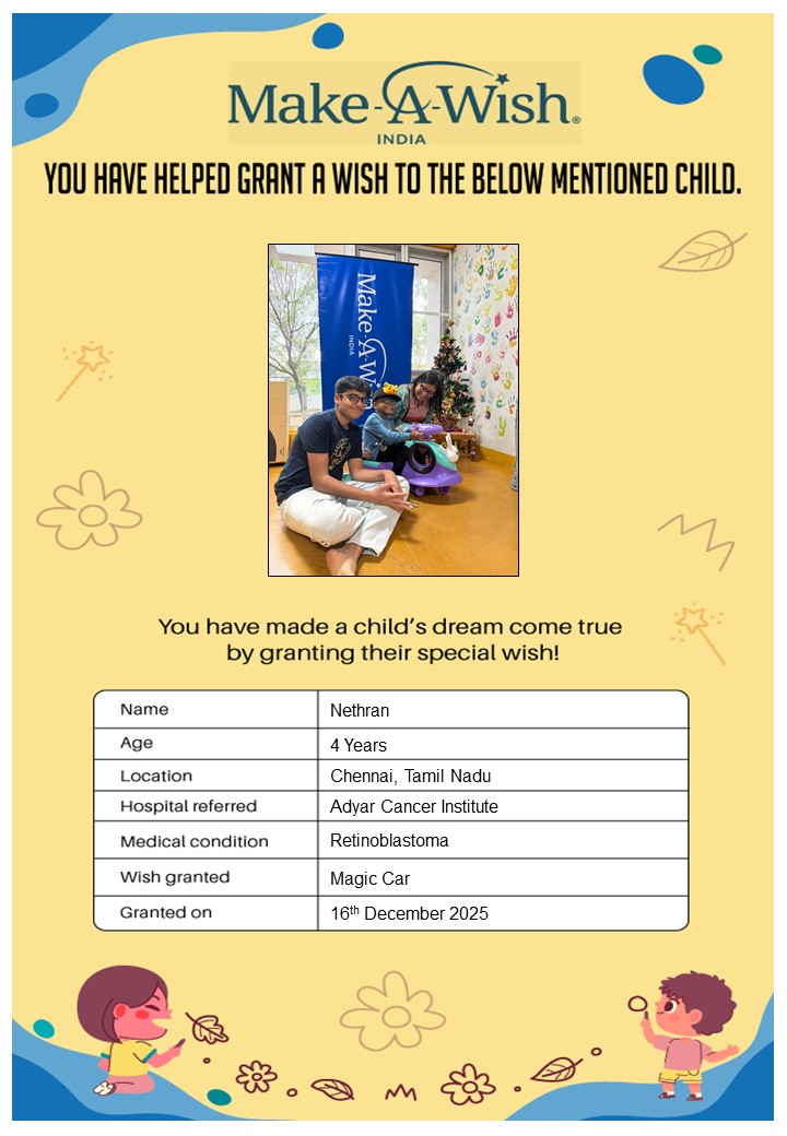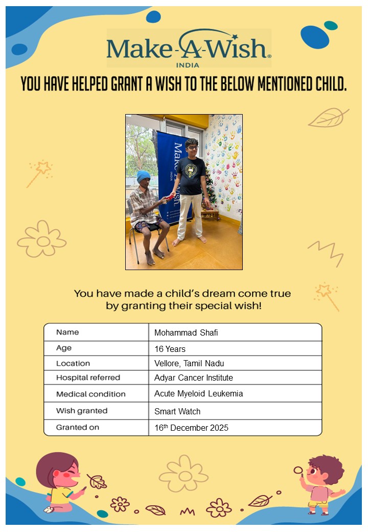 This is done in partnership with the NGO, Make-A-Wish India, which brings hope, strength, and joy to children battling life-threatening illnesses. For these children, a single wish can transform despair into courage and help them see beyond their illness.