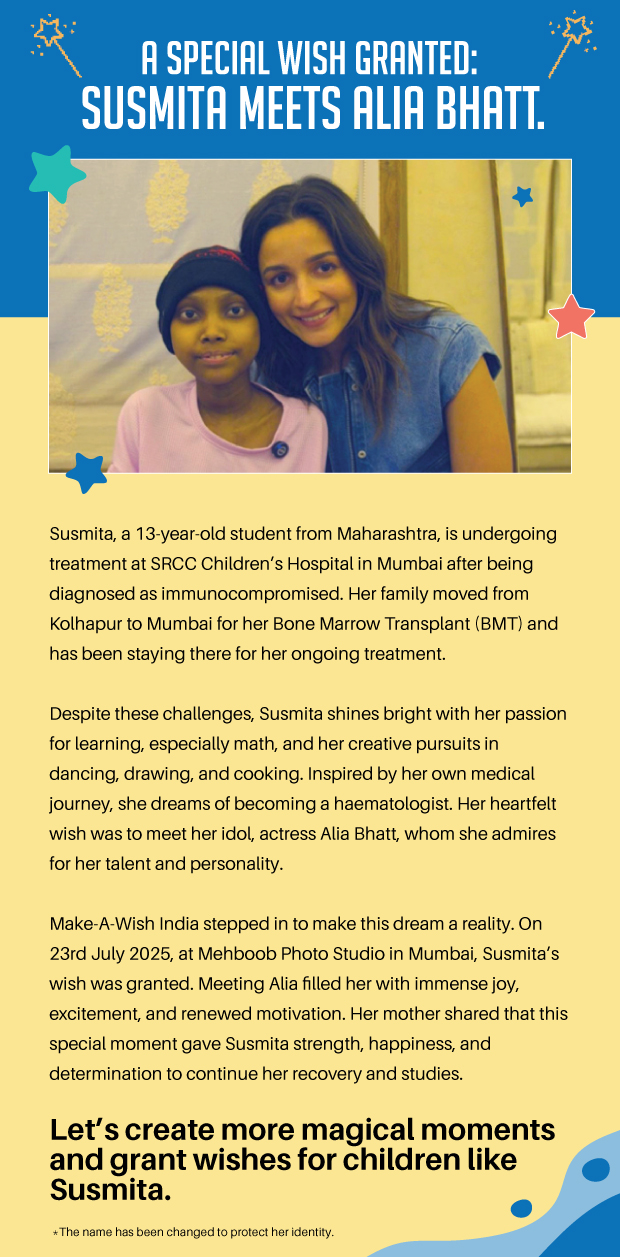 Each wish costs just INR 10000, and its impact is priceless. Since 1995, Make-A-Wish India has granted over 95,000 wishes in partnership with 120+ hospitals and 8 regional chapters. Wishes generally fall into four categories: “I wish to go” – trips or experiences to places they dream of visiting, “I wish to meet” – meeting their heroes or inspiring personalities, “I wish to be” – living out a special role or dream for a day, and “I wish to have” – receiving a special gift or item that brings joy. Every wish, no matter how big or small, makes a lasting difference in a child’s healing journey.