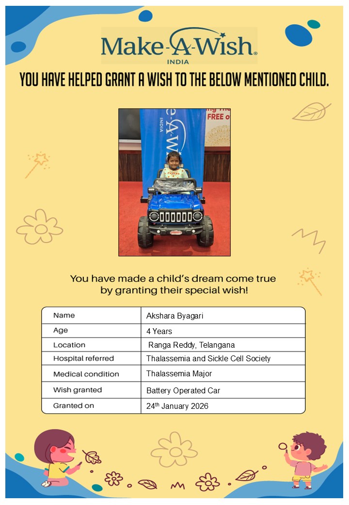 But every wish is far more than a gift; it can be a turning point in a child’s medical journey. For children, a wish sparks the courage and determination to face treatment; for parents, it restores optimism in the darkest times; and for doctors, it often leads to better treatment adherence, with 81% confirming improved outcomes. Families too feel the transformation, with 96% reporting better emotional health in their children. For communities, donors, and volunteers, each wish reveals the profound joy and impact of giving.