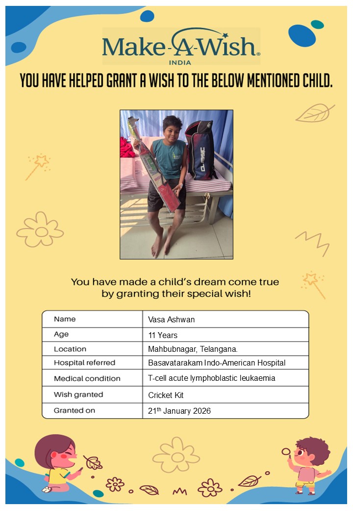 By supporting this campaign, you can help turn a child’s dream into reality, giving them strength, hope, and smiles for a brighter future. Your contribution spreads joy, courage, and inspiration to children in Hyderabad who need it most and helps them believe in the magic of dreams, even in the toughest times.
