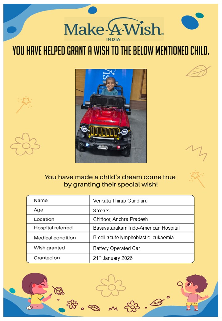 At an average cost of INR 10,000, every wish covers planning, logistics, and the magical experience itself, and by supporting this campaign, you are not just creating smiles but giving children hope, strength, and a better chance of recovery.