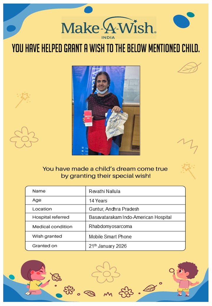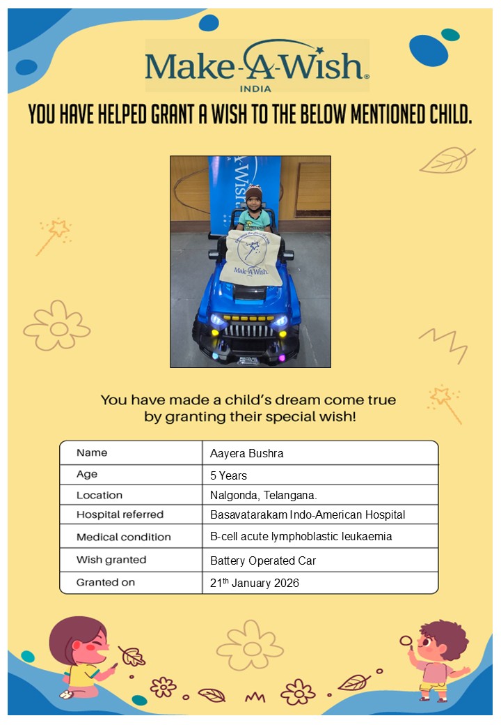 At an average cost of INR 10,000, every wish covers planning, logistics, and the magical experience itself, and by supporting this campaign, you are not just creating smiles but giving children hope, strength, and a better chance of recovery.
