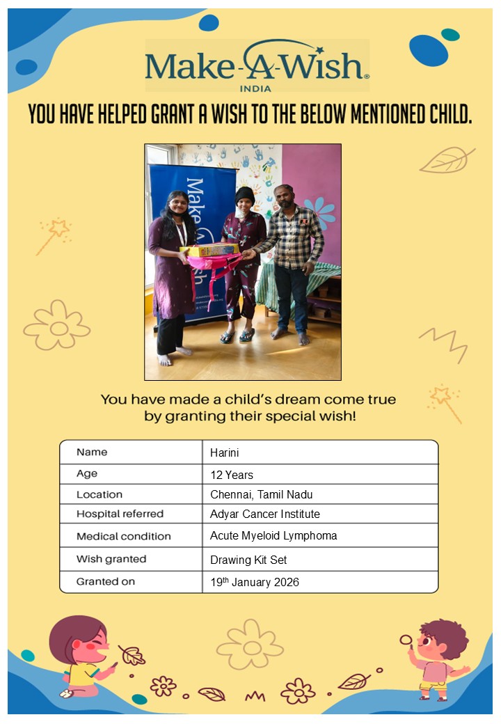 At an average cost of INR 10,000, every wish covers planning, logistics, and the magical experience itself, and by supporting this campaign, you are not just creating smiles but giving children hope, strength, and a better chance of recovery.