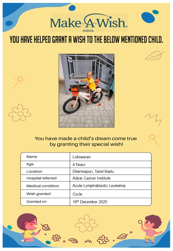 By supporting this campaign, you can help turn a child’s dream into reality, giving them strength, hope, and smiles for a brighter future. Your contribution spreads joy, courage, and inspiration to children in Chennai who need it most and helps them believe in the magic of dreams, even in the toughest times.
