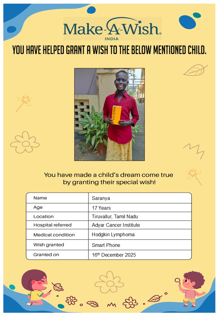 By supporting this campaign, you can help turn a child’s dream into reality, giving them strength, hope, and smiles for a brighter future. Your contribution spreads joy, courage, and inspiration to children in Chennai who need it most and helps them believe in the magic of dreams, even in the toughest times.