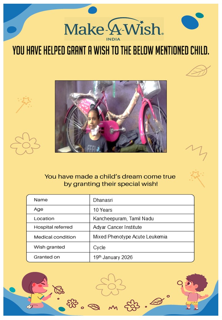 By supporting this campaign, you can help turn a child’s dream into reality, giving them strength, hope, and smiles for a brighter future. Your contribution spreads joy, courage, and inspiration to children in Chennai who need it most and helps them believe in the magic of dreams, even in the toughest times.