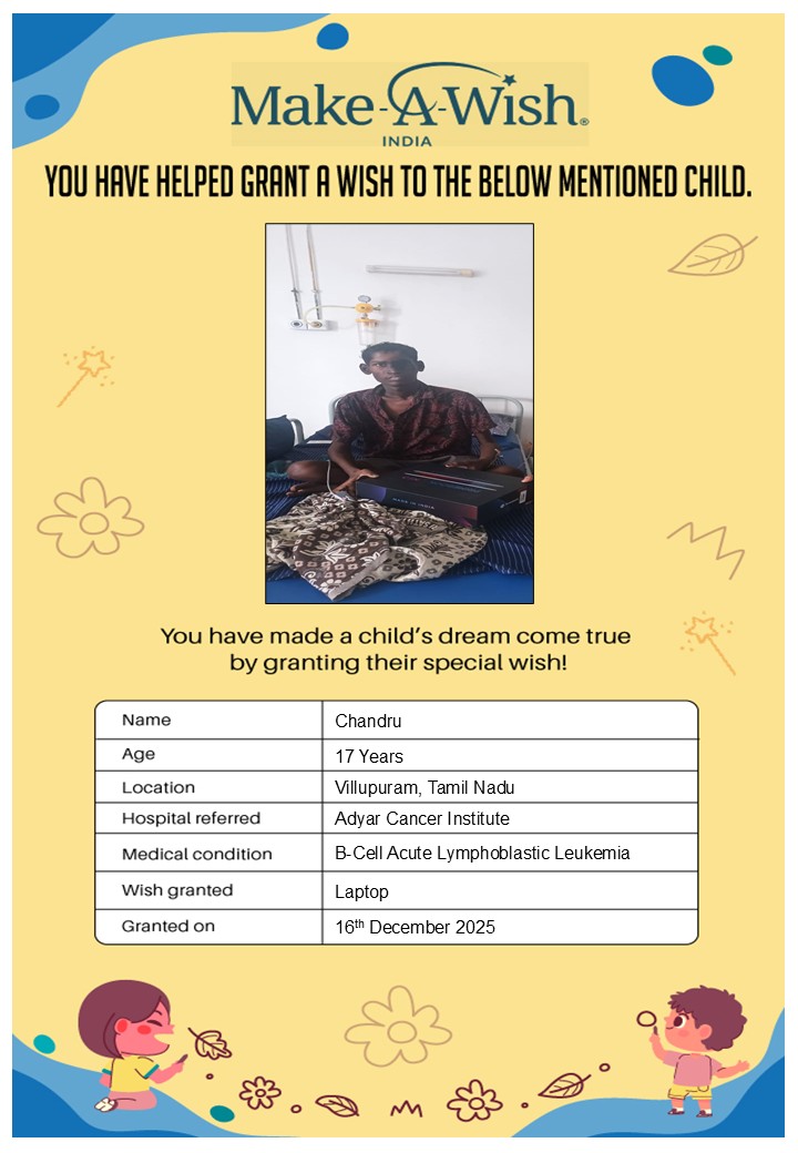 By supporting this campaign, you can help turn a child’s dream into reality, giving them strength, hope, and smiles for a brighter future. Your contribution spreads joy, courage, and inspiration to children in Chennai who need it most and helps them believe in the magic of dreams, even in the toughest times.