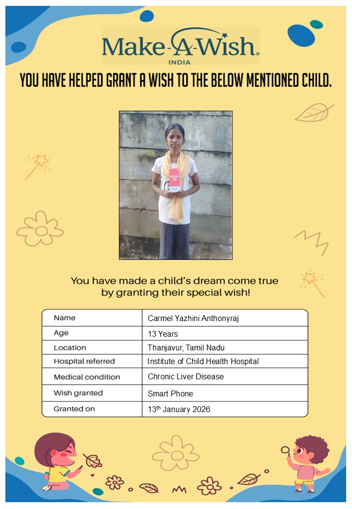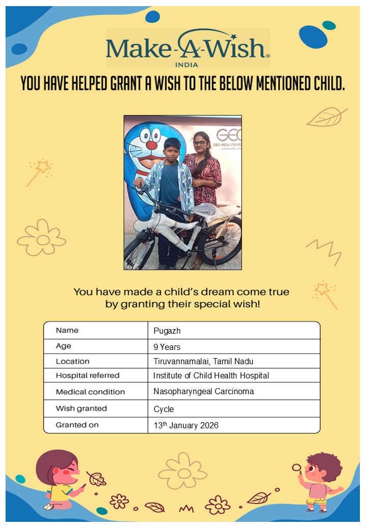 By supporting this campaign, you can help turn a child’s dream into reality, giving them strength, hope, and smiles for a brighter future. Your contribution spreads joy, courage, and inspiration to children in Chennai who need it most and helps them believe in the magic of dreams, even in the toughest times.