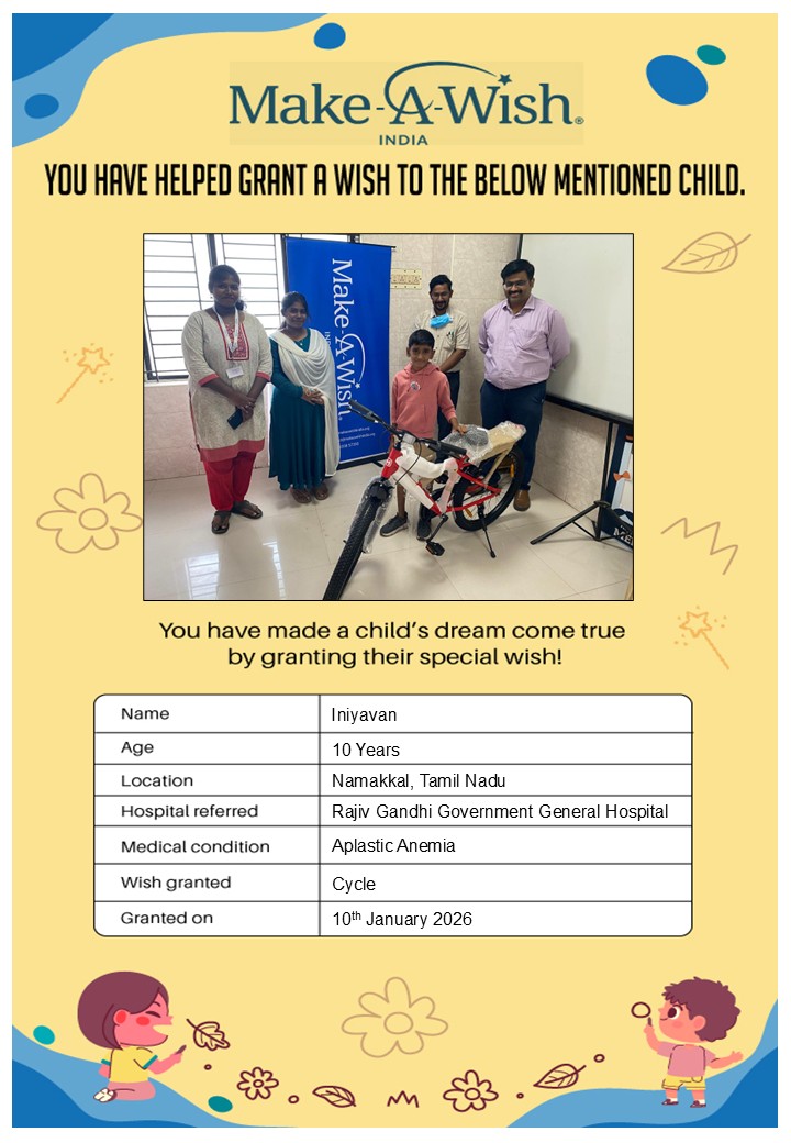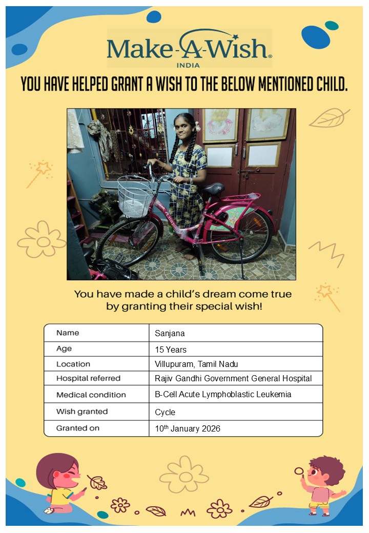 By supporting this campaign, you can help turn a child’s dream into reality, giving them strength, hope, and smiles for a brighter future. Your contribution spreads joy, courage, and inspiration to children in Chennai who need it most and helps them believe in the magic of dreams, even in the toughest times.