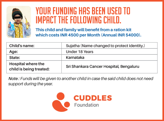 This campaign of mine is being done in partnership with the NGO -Cuddles Foundation and aims to fight hunger and malnutrition in children from low-income homes by giving them a MONTHLY RATION BASKET. This improves their chance of survival by 70% and ultimately does save lives. The baskets are given to children at Mazumdar Shaw Medical Centre, St John's Hospital and Sri Shankara Cancer Foundation in Bengaluru, KLE's Dr. Prabhakar Kore Hospital and Medical Research Centre in Belgaum and Kasturba Medical Hospital in Manipal.