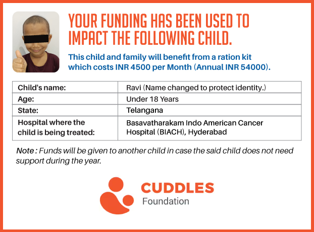 This campaign of mine is being done in partnership with the NGO -Cuddles Foundation and aims to fight hunger and malnutrition in children from low-income homes by giving them a MONTHLY RATION BASKET. This improves their chance of survival by 70% and ultimately does save lives. The baskets are given to children at the Basavatarakam Indo-American Cancer Hospital and MNJ Hospital for Oncology in Hyderabad.