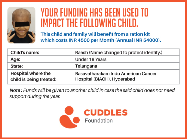 This campaign of mine is being done in partnership with the NGO -Cuddles Foundation and aims to fight hunger and malnutrition in children from low-income homes by giving them a MONTHLY RATION BASKET. This improves their chance of survival by 70% and ultimately does save lives. The baskets are given to children at the Basavatarakam Indo-American Cancer Hospital and MNJ Hospital for Oncology in Hyderabad.