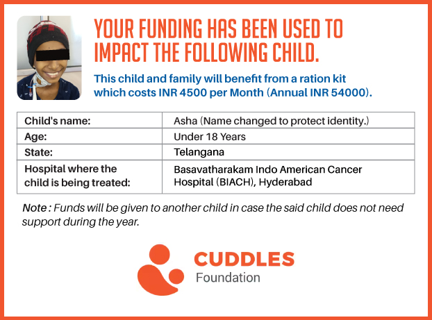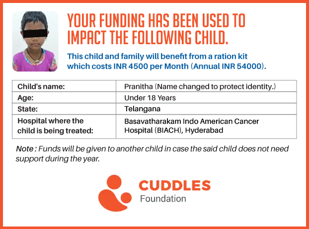 This campaign of mine is being done in partnership with the NGO -Cuddles Foundation and aims to fight hunger and malnutrition in children from low-income homes by giving them a MONTHLY RATION BASKET. This improves their chance of survival by 70% and ultimately does save lives. The baskets are given to children at the Basavatarakam Indo-American Cancer Hospital and MNJ Hospital for Oncology in Hyderabad.