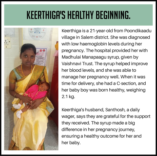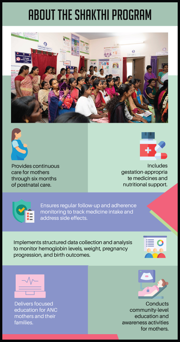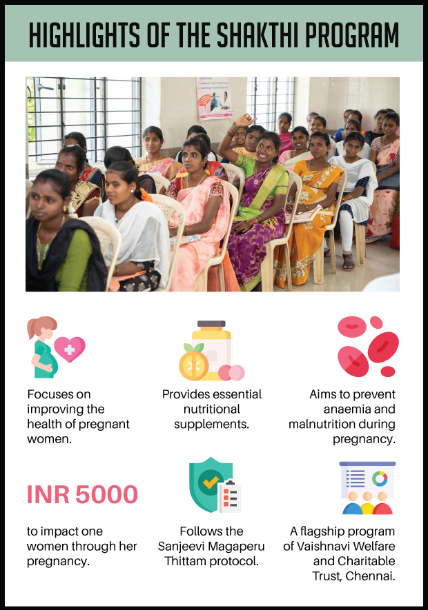 The Shakthi Program, is a flagship program of Vaishnavi Welfare and Charitable Trust, an NGO based in Chennai. This is a dedicated initiative focuses on improving the health of pregnant women, particularly in rural areas across Salem, Kallakurichi and Nilgiris. The program works to prevent anaemia and malnutrition during pregnancy to produce healthy mothers delivering healthy babies.