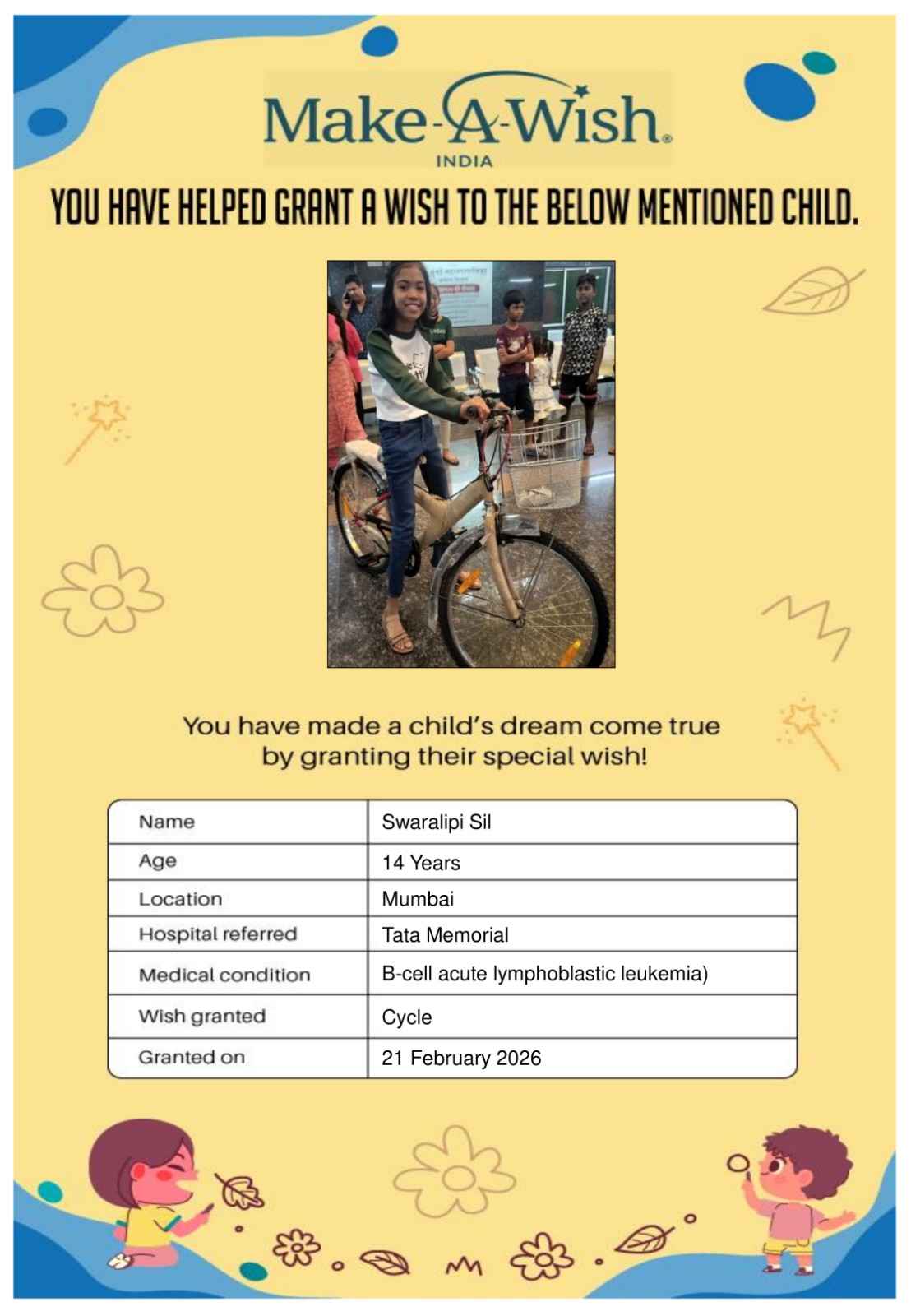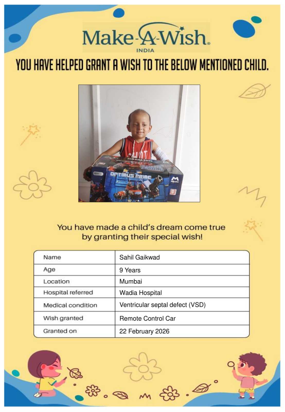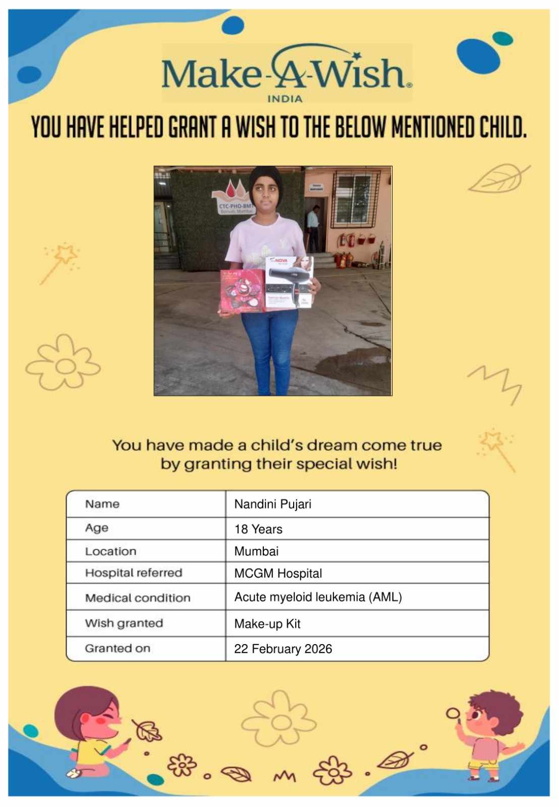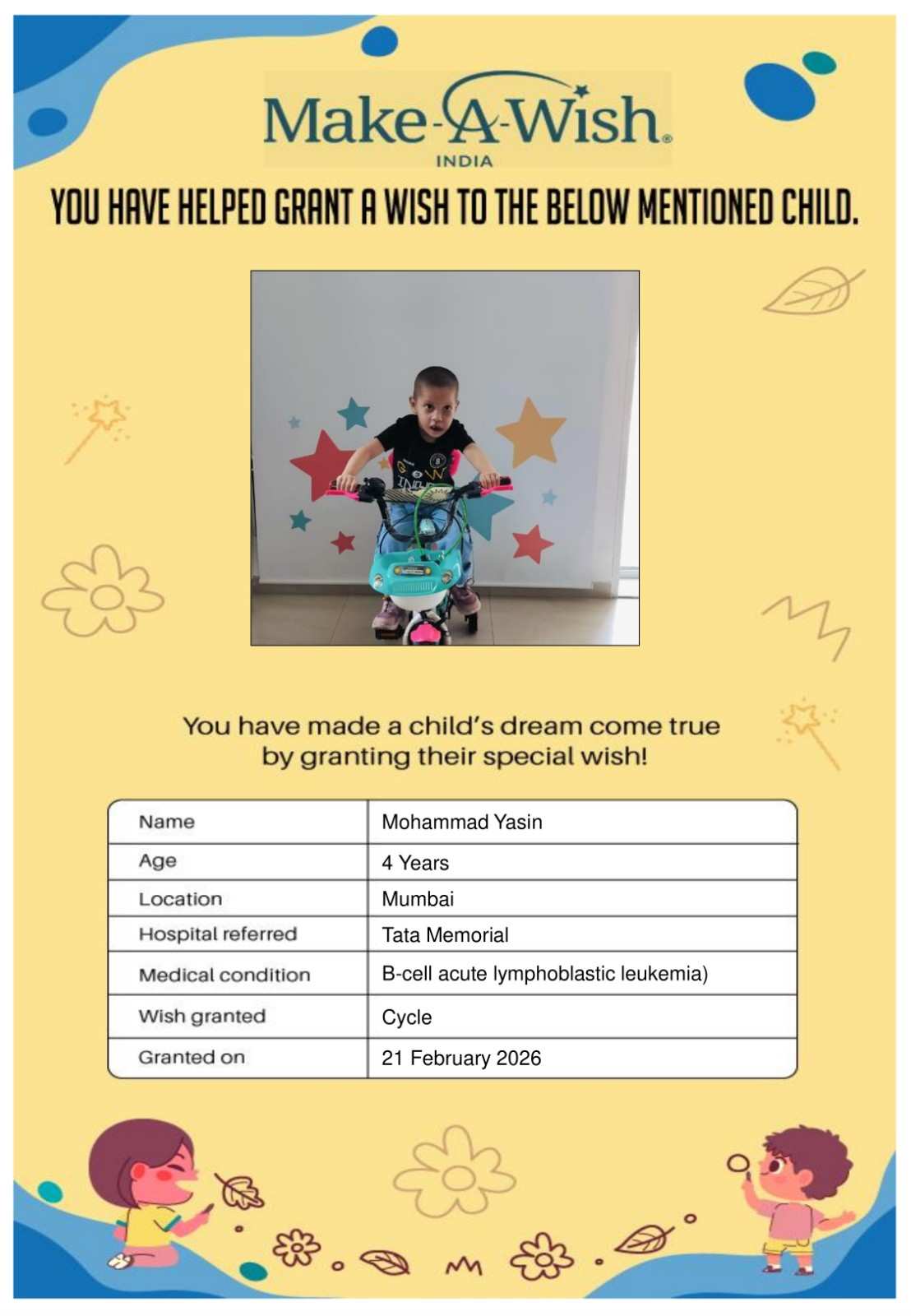 By supporting this campaign, you can help turn a child’s dream into reality, giving them strength, hope, and smiles for a brighter future. Your contribution spreads joy, courage, and inspiration to children in Mumbai who need it most and helps them believe in the magic of dreams, even in the toughest times.