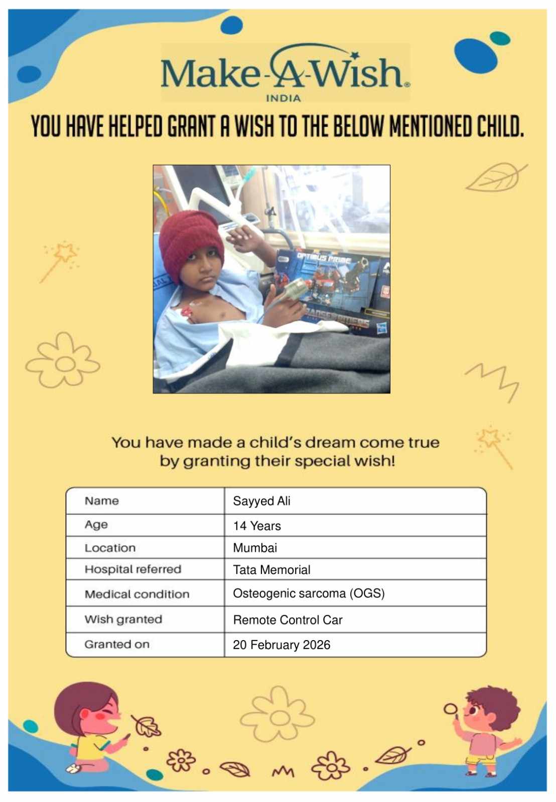 At an average cost of INR 10,000, every wish covers planning, logistics, and the magical experience itself, and by supporting this campaign, you are not just creating smiles but giving children hope, strength, and a better chance of recovery.