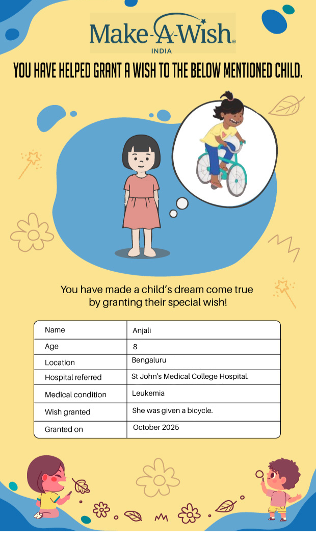 Make-A-Wish India Trust has been granting life-changing wishes to children with critical illnesses since 1995. For children between the ages of 3–18 years, who spend much of their lives in hospitals undergoing painful treatments, a wish is more than just a fleeting joy; it becomes a vital part of their healing journey. Research shows that wishes bring emotional and psychological strength, often improving treatment adherence and enhancing quality of life. With 8 chapters across India, partnerships with over 120 hospitals, and more than 98,000 wishes granted, the foundation is now working towards the milestone of 100,000 wishes by 2025.