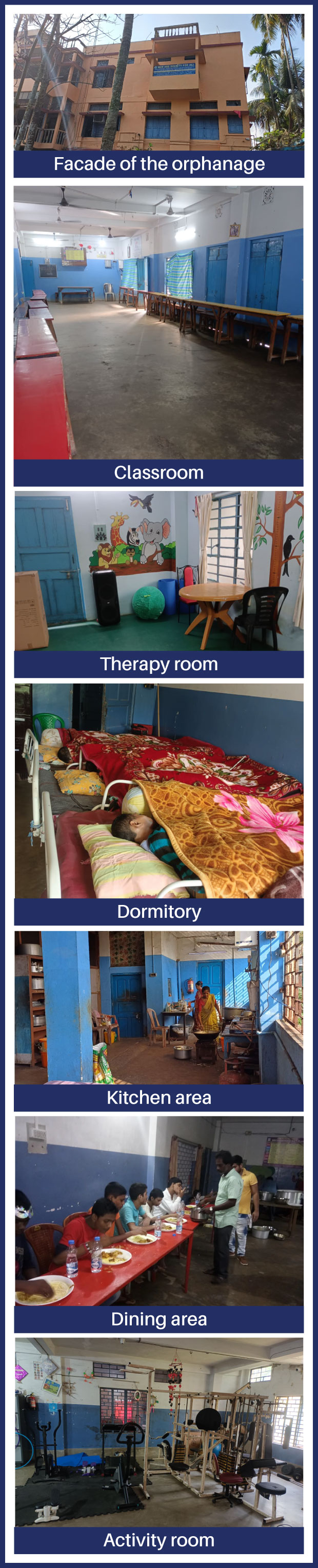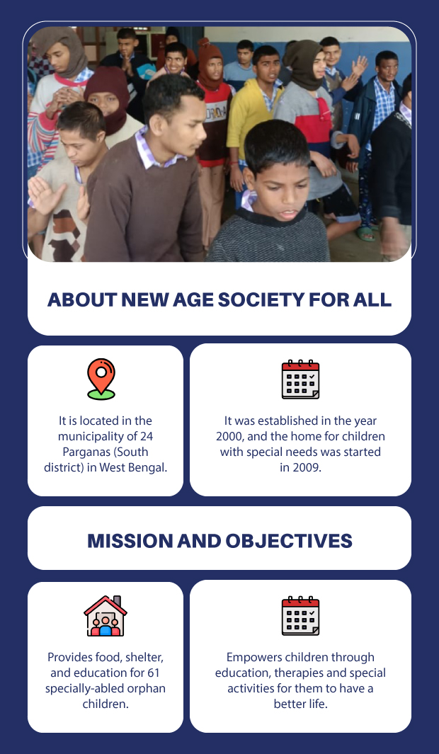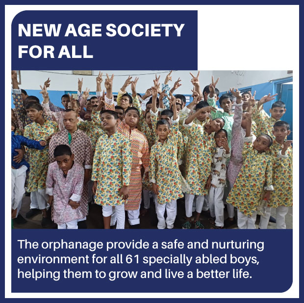 The children residing at the orphanage attend School, conveniently located within the same campus and operated by the New Age Society for All, and some children go to an NGO named REACH India for their education, which is 3 days per week for their external classes. The orphanage takes care of children who are mentally challenged, speech and hearing-impaired, and also differently-abled.
