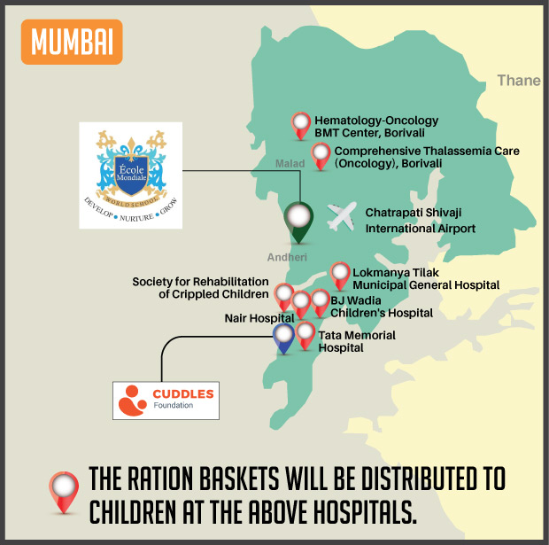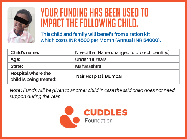 This campaign of mine is being done in partnership with the NGO -Cuddles Foundation and aims to fight hunger and malnutrition in children from low-income homes by giving them a MONTHLY RATION BASKET. This improves their chance of survival by 70% and ultimately does save lives. The baskets are given to children at the Tata Memorial Hospital, BJ Wadia Children's Hospital, Lokmanya Tilak Municipal General Hospital, Nair Hospital, King Edward Memorial Hospital, Comprehensive Thalassemia Care Pediatric Hematology-Oncology BMT Centre, and Society for Rehabilitation of Crippled Children in Mumbai. This costs just INR 4500 per month.