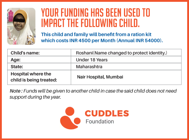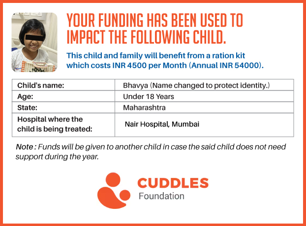 This campaign of mine is being done in partnership with the NGO -Cuddles Foundation and aims to fight hunger and malnutrition in children from low-income homes by giving them a MONTHLY RATION BASKET. This improves their chance of survival by 70% and ultimately does save lives. The baskets are given to children at the Tata Memorial Hospital, BJ Wadia Children's Hospital, Lokmanya Tilak Municipal General Hospital, Nair Hospital, King Edward Memorial Hospital, Comprehensive Thalassemia Care Pediatric Hematology-Oncology BMT Centre, and Society for Rehabilitation of Crippled Children in Mumbai. This costs just INR 4500 per month.