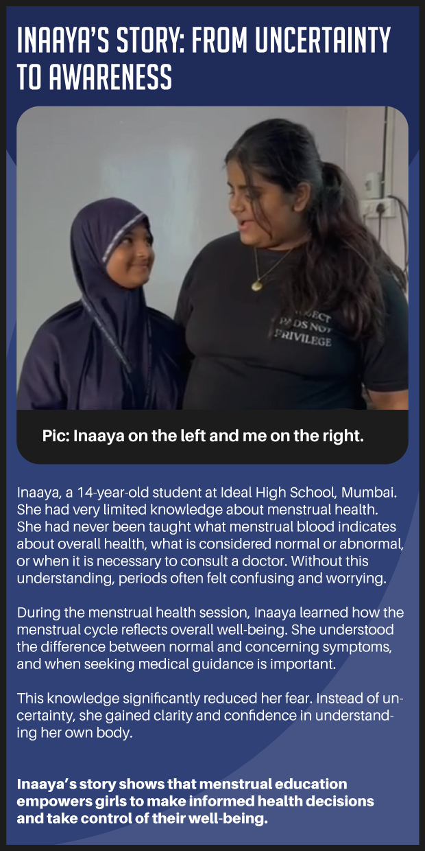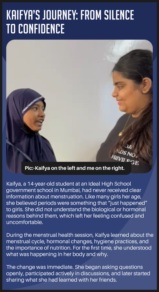 I started this initiative after learning how deeply menstrual stigma and period poverty affect girls and women across India. What began as research soon became personal when I spoke directly with women and girls in Dharavi. I realised that the issue is not only about access to products, but also about awareness, affordability, and dignity.