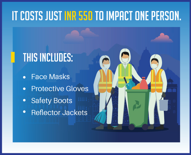 I have partnered with Financial Inclusion Improves Sanitation and Health (FINISH) Society to support Jaipur's sanitation workers in every way possible. We aim to give them PPE kits to keep them safe.